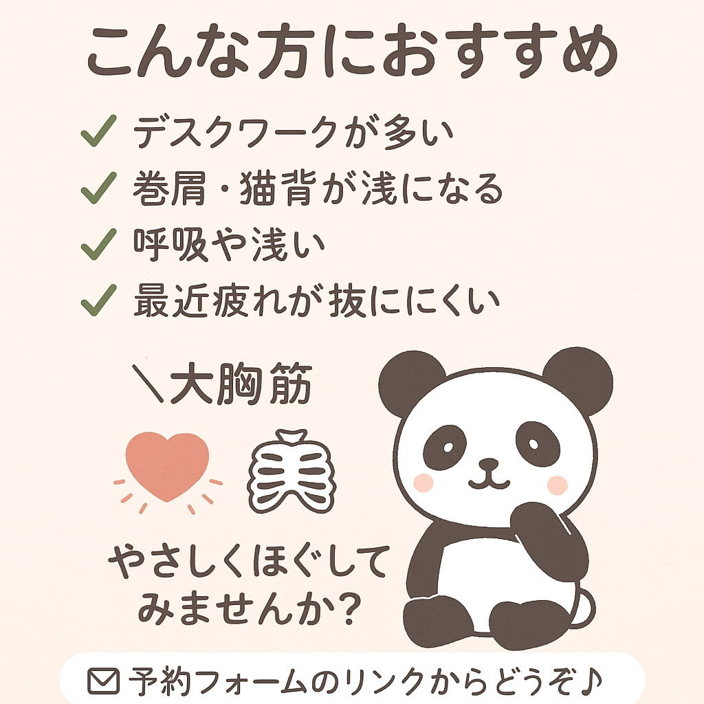 大胸筋の不調を改善することで、呼吸が楽になり、全身の血行が良くなり、心も体も軽くなります。ぜひ、ご自身のコンディションを整えにいらしてください。